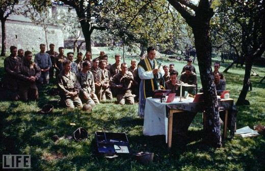 New Advent featured some great photos the other day from World War 2, one of which is the photo above of the Holy Sacrifice of the Mass celebrated for soldiers in France.