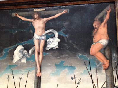 While at the Art Institute in Chicago, I saw this depiction of the crucifixion in which the bad thief was depicted as rather hefty. Perhaps he was a thief and a glutton. The painting is by Lucas Cranach the Elder. Apparently, he was acquainted with Martin Luther – come to think of it – maybe the plump man is Luther!